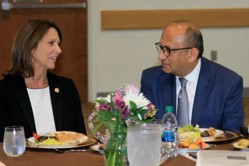 Texas Senator Angela Paxton and Amyn Merchant, Resource Development & Financial Strategy Director at the Academies, discussing unique approaches of identifying talent for the Academies. Photo: Ali Dhamani