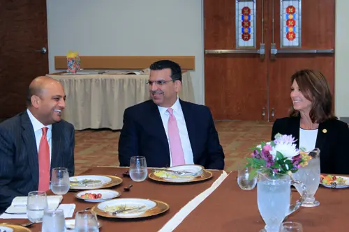 Amyn Merchant, Resource Development & Financial Strategy Director at the Aga Khan Academies and Nizar Didarali, President of the Ismaili Council for Central USA, welcome Texas Senator Angela Paxton. Photo: Ali Dhamani