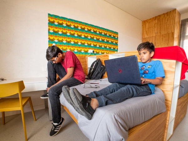 Students share rooms with three roommates, each with a study table and storage, and enjoy a common room for games, TV and snacks. Our day starts at 6 am, followed by school from 7:45 am to 2:45 pm with breaks, then study time, free time, sports or gym. Dinner is at 6:15 pm, followed by more study or relaxation, with lights out at 9:30 pm.