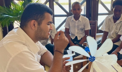 A student explores renewable energy solutions through a combined power prototype.